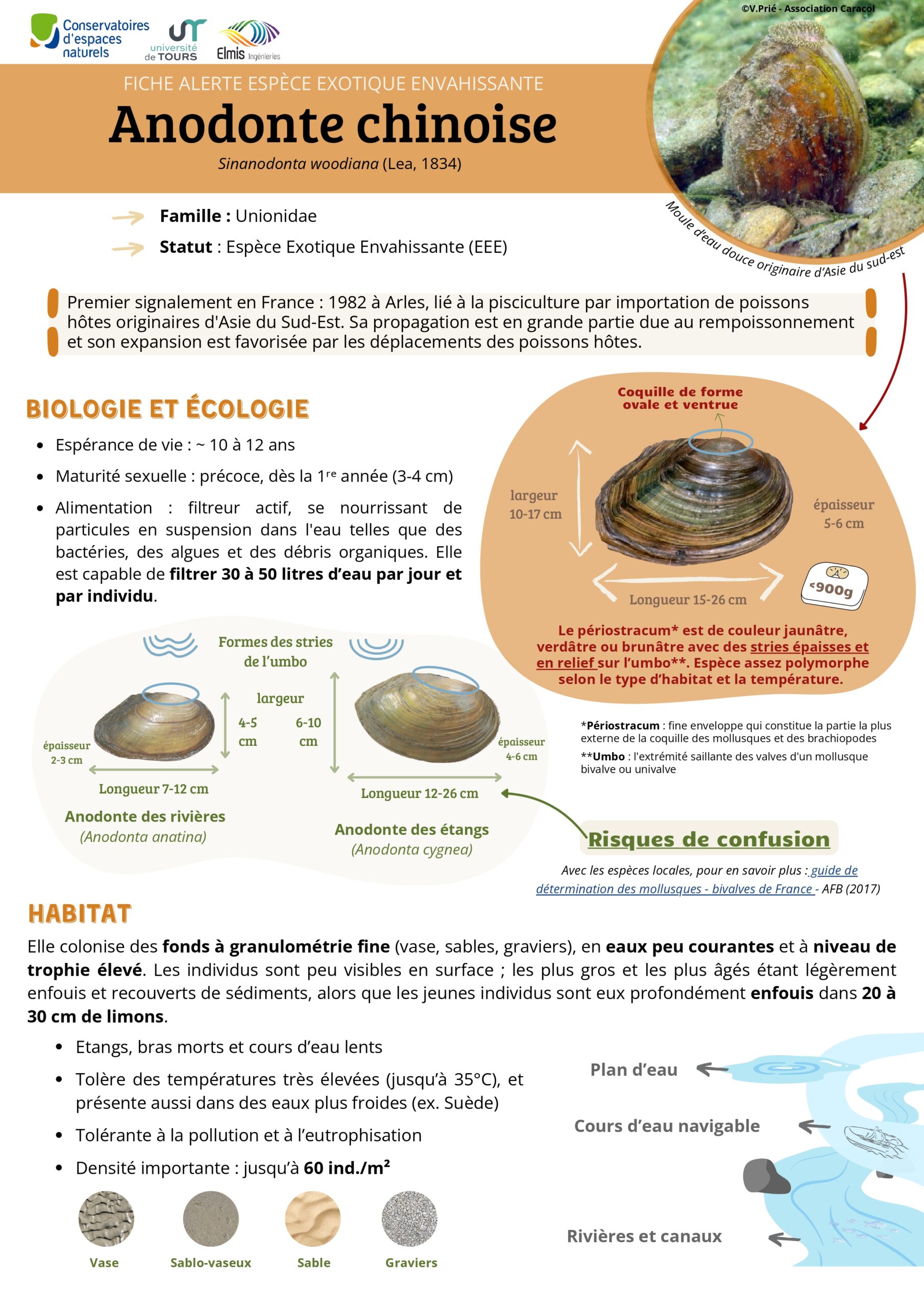 La Fédération des Conservatoires d’espaces naturels (FCEN), en collaboration avec l’Université de Tours et le laboratoire CETU Elmis, vous présente la fiche alerte sur l’Anodonte chinoise, réalisée dans le cadre de l’animation du groupe de travail EEE du bassin Loire-Bretagne.